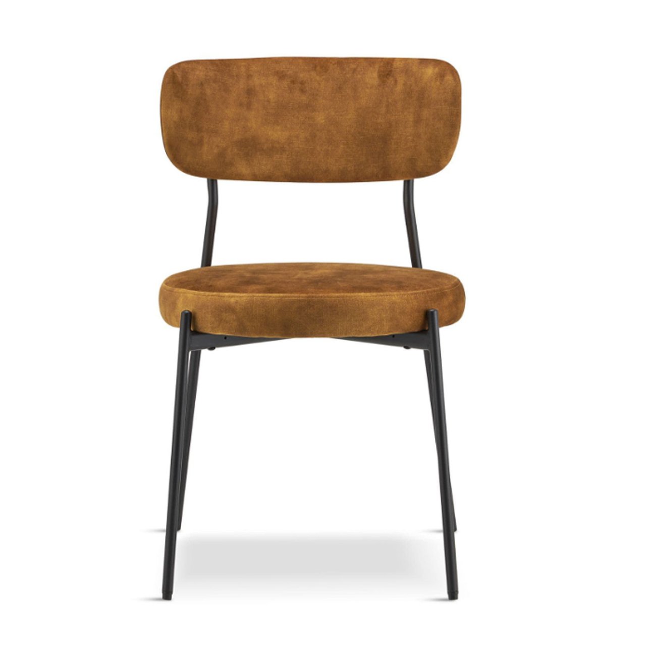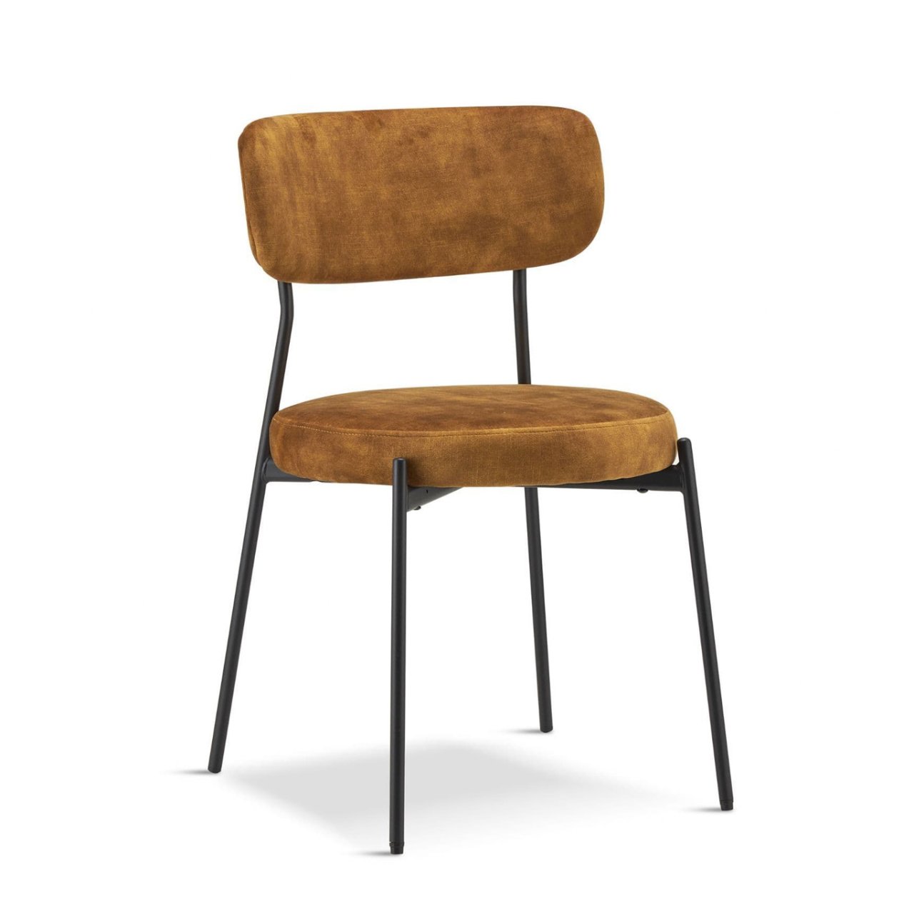 Slim black metal legs provide a sleek contrast to the cushioned seat and back, giving the chair a contemporary edge that photographs well and suits modern interiors. The mustard yellow velvet upholstery adds richness and visual interest, making it an excellent choice for creating feature dining areas or adding a pop of colour to neutral schemes.