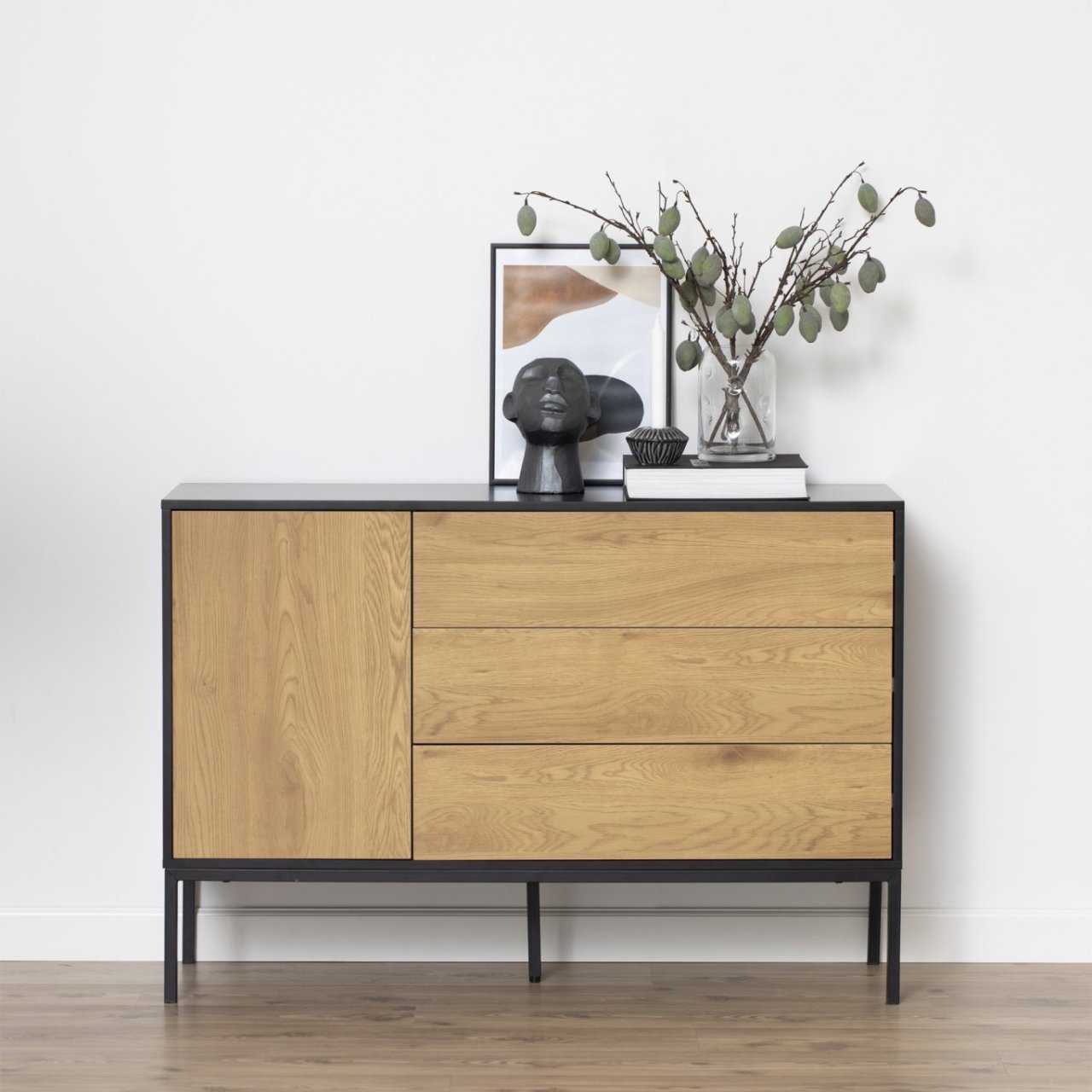 The See 1 door 3 drawer sideboard offers the perfect blend of minimalist elegance and functional storage. It features a black painted top and frame which stand in contrast with the oak finish of the door and drawers. The base is made from matt black powder-coated steel to ensure durability with five slim legs giving the piece height and stability. The door and drawers have a push to open function which allows the piece to have a clean, handle-free design ideal for modern, minimalist interiors.