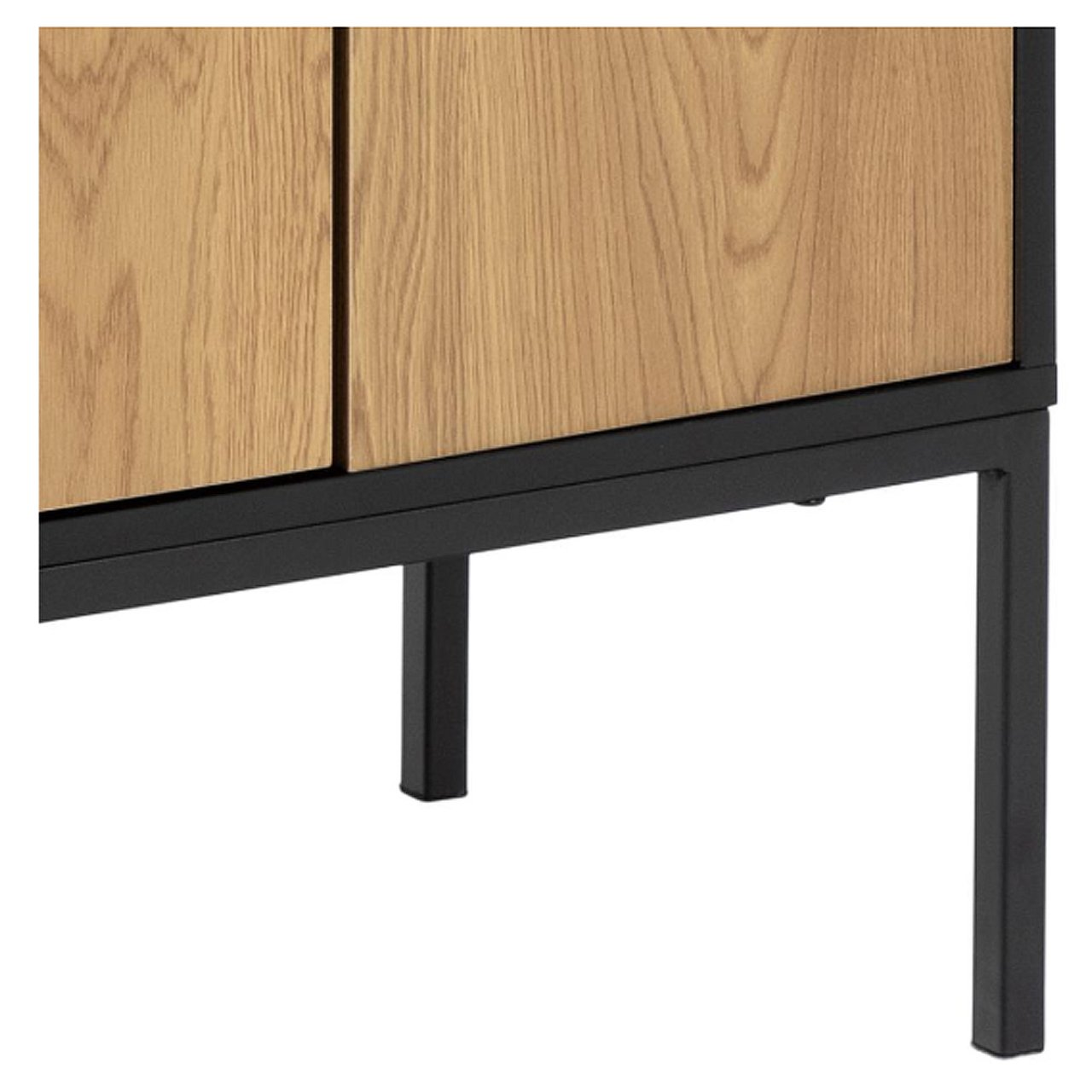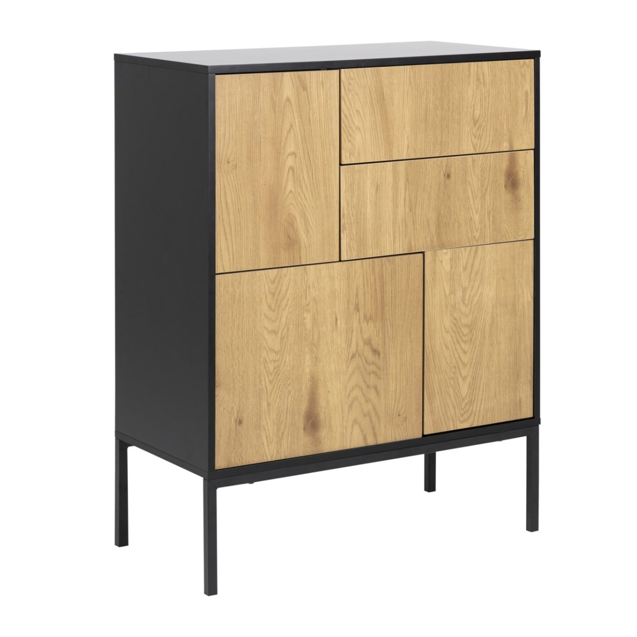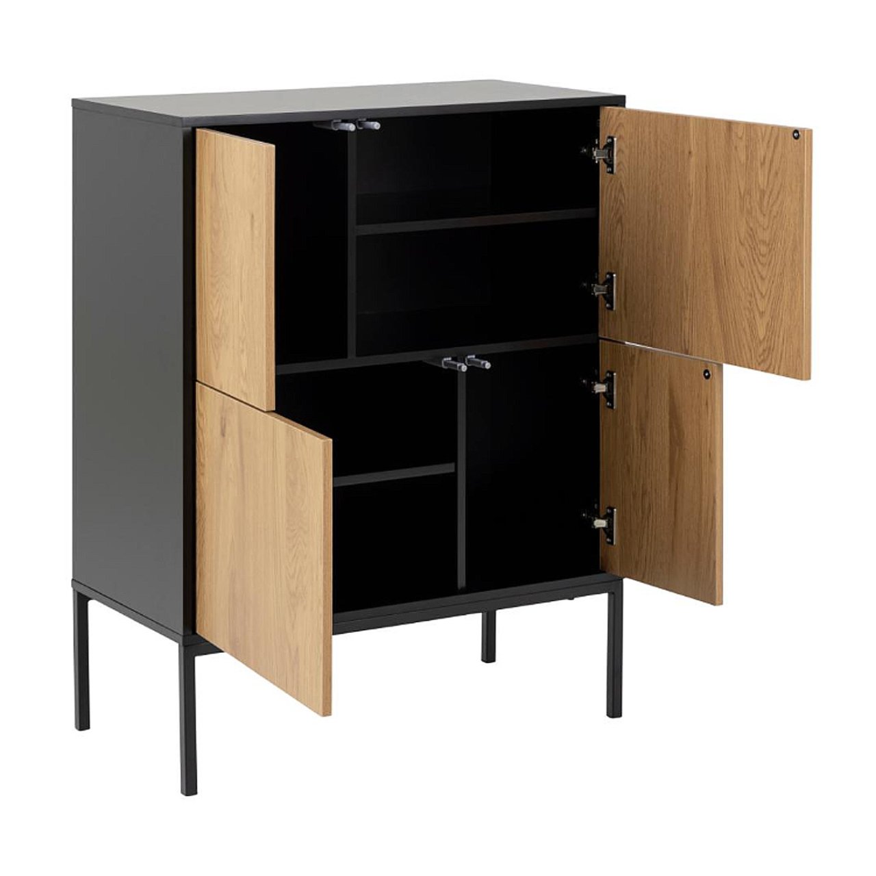 The See 4 Door Sideboard offers the perfect blend of minimalist elegance and functional storage. It features a black painted top and frame which stand in contrast with the oak finish of the doors. The base is made from matt black powder-coated steel to ensure durability with five slim legs giving the piece height and stability. The doors have a push to open function which allows the piece to have a clean, handle-free design ideal for modern, minimalist interiors.