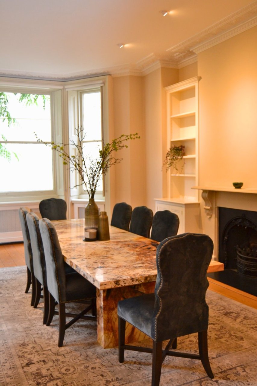This scheme shows how thoughtful furniture selection can strengthen the character of older London properties by blending modern comfort with timeless details.