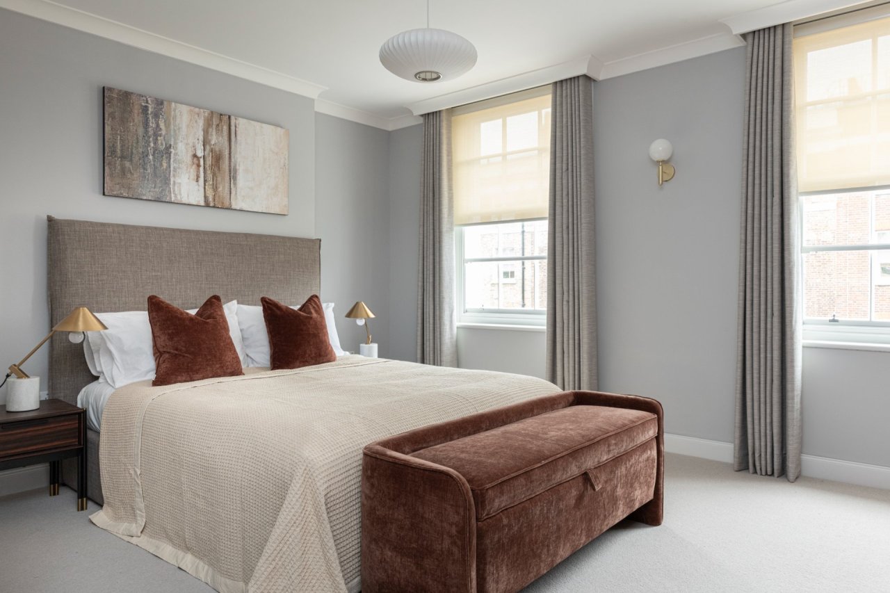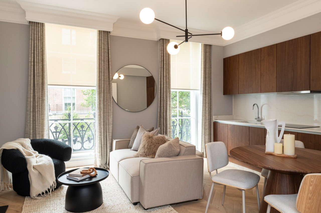 This central London showhome scheme is modern, homey and filled with warm neutrals, walnut finishes and creamy tones that reflect the character of its affluent Marble Arch location near Oxford Street. The interiors balance calm sophistication with distinctive character, showcasing the type of refined city living that appeals to buyers and renters.