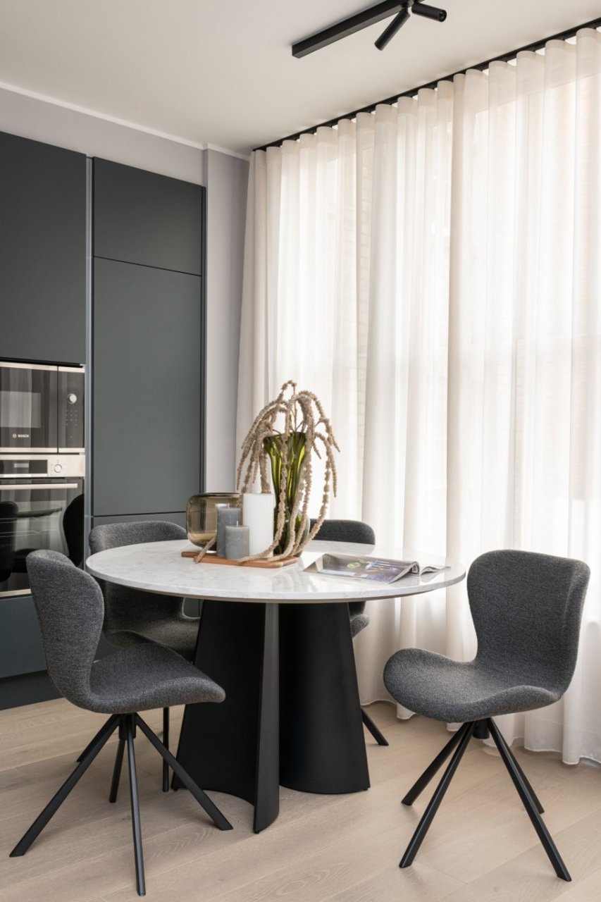 The showstopping centrepiece is an impressive marble dining table in the living area. This statement piece perfectly encapsulates our approach: furniture that's both beautiful and functional, creating memorable moments that help buyers envision their future life in the space.